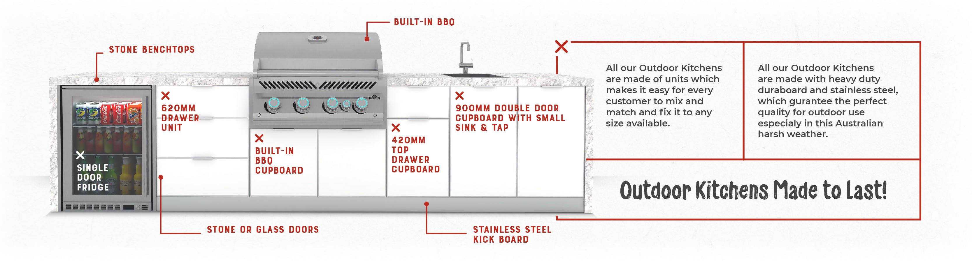 Our Outdoor Kitchen cupboards are built from a strong material that is water resistant and fire retardant, making them strong to last in all weather conditions.